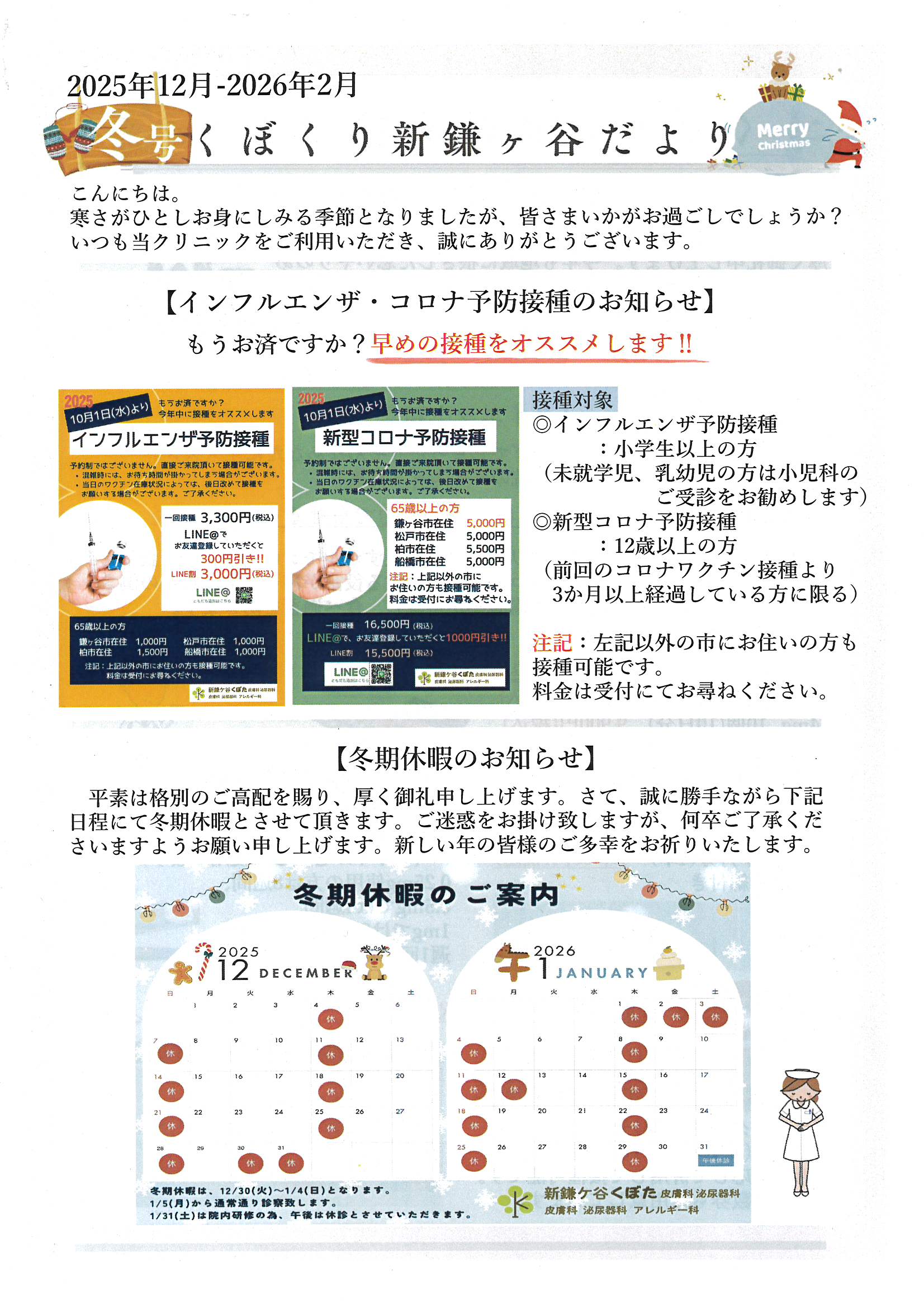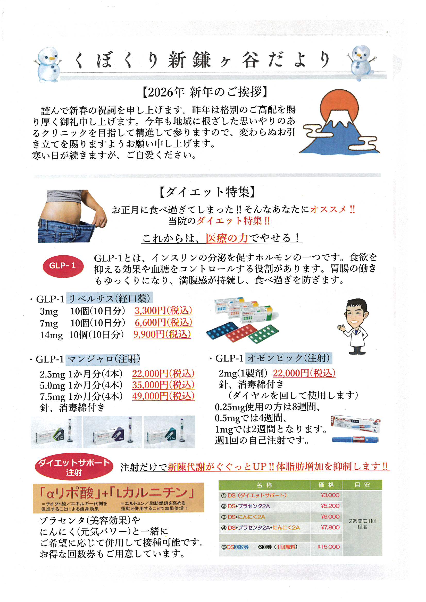 今回の冬号は、インフル・コロナ予防接種、ダイエット特集、冬季休暇のお知らせ、少し気が早いですが新年のご挨拶、盛りだくさんで発行しております🤩